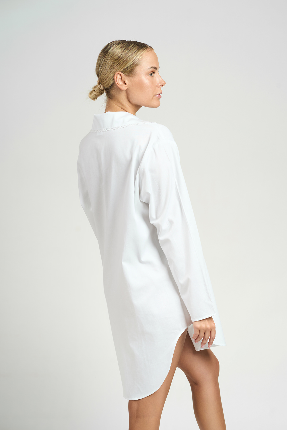 The asymmetrical cut gives the shirt an original character. Openings on the sides expose the legs, adding a sensual expression. The elaborate lace decorates its edges, giving charm and feminine charm, and the mother-of-pearl buttons are an elegant detail that catches the eye.