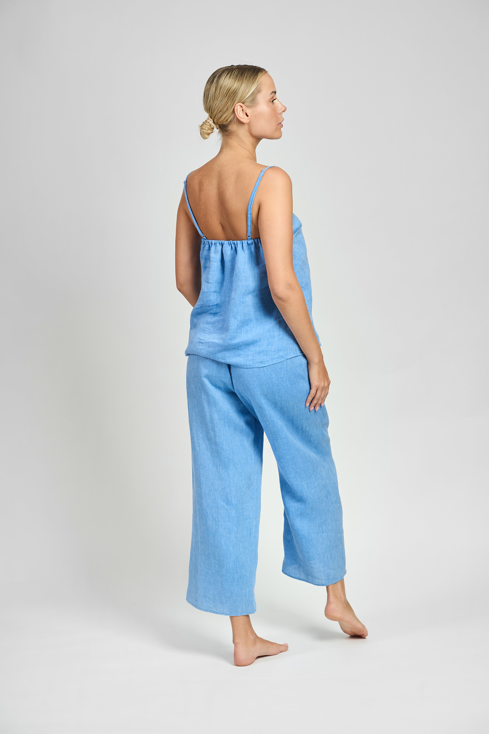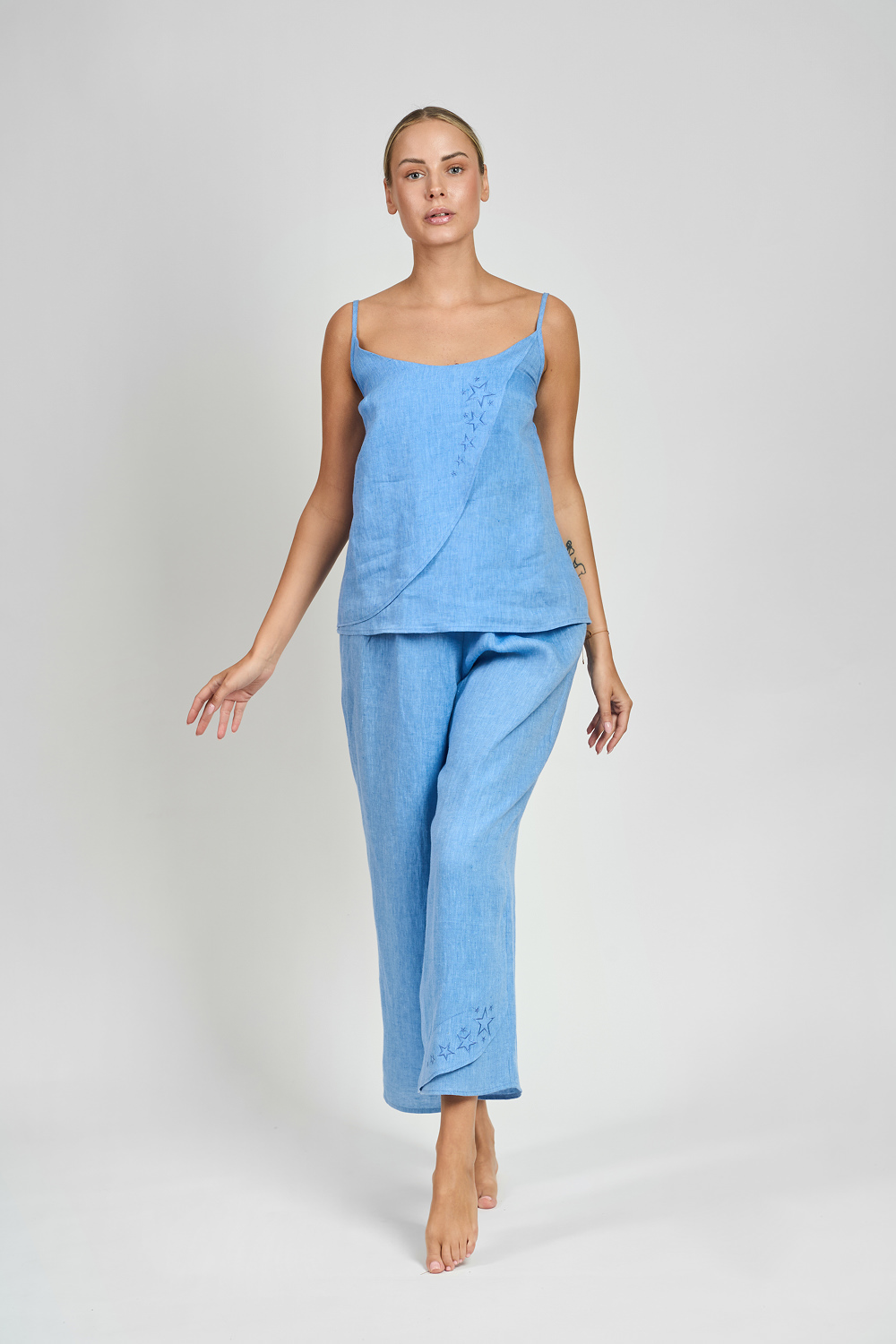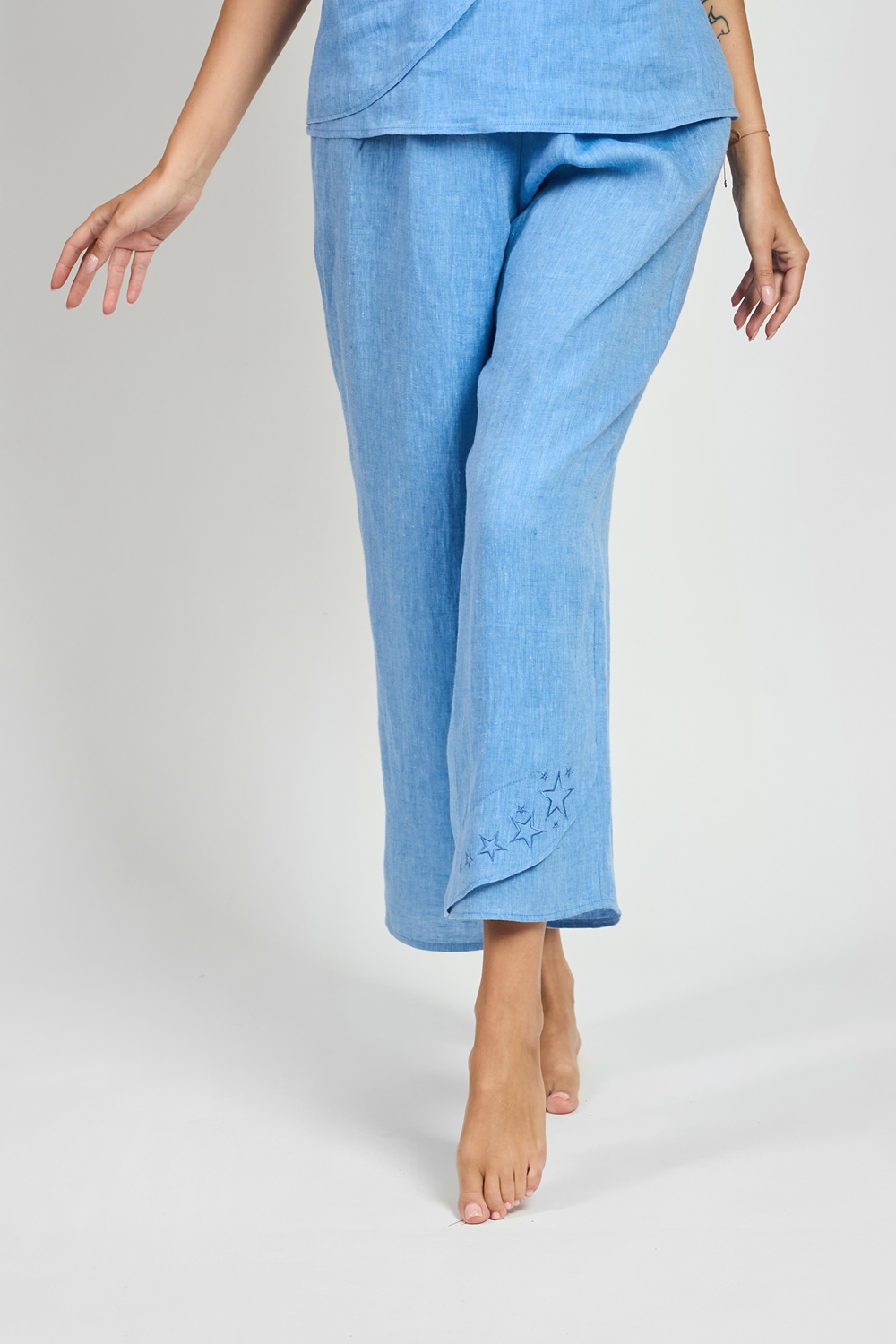Dive into the depths of relaxation with the Starlight long pants. Made of ultra-soft linen, they fit perfectly thanks to the elastic band, providing comfort and freedom of movement. Decorative detail with embroidered stars, highlights their unique design. Perfect for relaxation, rest and comfortable sleep.