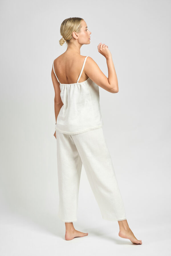Long pants: They envelop the legs with the delicacy of natural linen, ensuring comfort and breathability even on warm nights. Elegant linen lace at the bottom adds romantic charm, and an elastic waistband guarantees freedom of movement without feeling constricted.