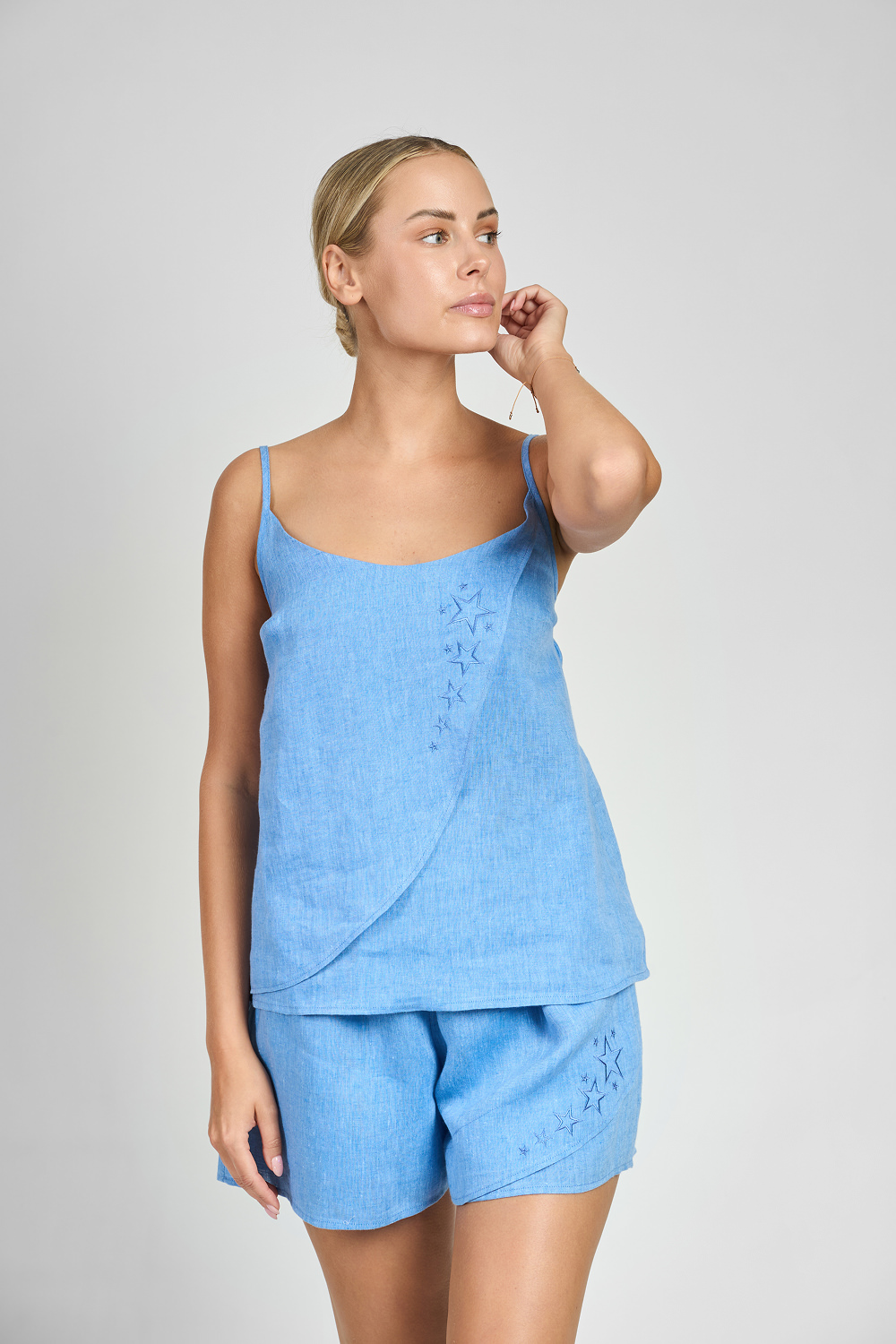 The set is sewn from softened linen, which wraps the body like a delicate mist. Subtle embroidery depicting twinkling stars gives each piece a touch of magical elegance. This set is not just a garment for sleeping – it is a journey to the land of rest, where each night transforms into a fairy tale full of peace and harmony.
