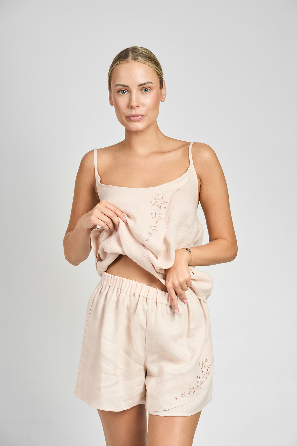 The set is sewn from softened linen, which wraps the body like a delicate mist. Subtle embroidery depicting twinkling stars gives each piece a touch of magical elegance. This set is not just a garment for sleeping – it is a journey to the land of rest, where each night transforms into a fairy tale full of peace and harmony.