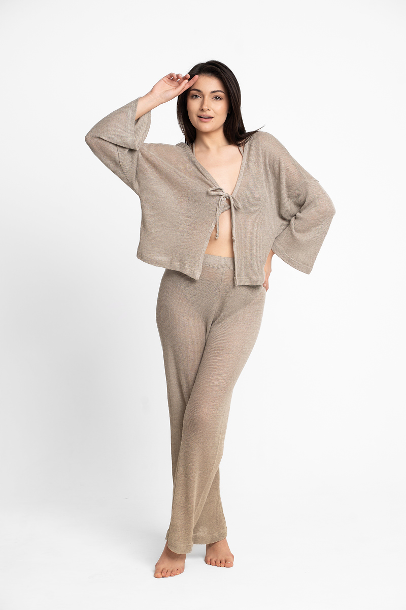 • Szlachetny len: To materiał, który żyje razem z Tobą. Dzięki swoim właściwościom termoregulacyjnym, lniana dzianina chłodzi w upalne dni i chroni przed wieczornym chłodem. Jest również antybakteryjna i hipoalergiczna, co czyni ją idealnym wyborem dla wrażliwej skóry po kąpielach słonecznych.