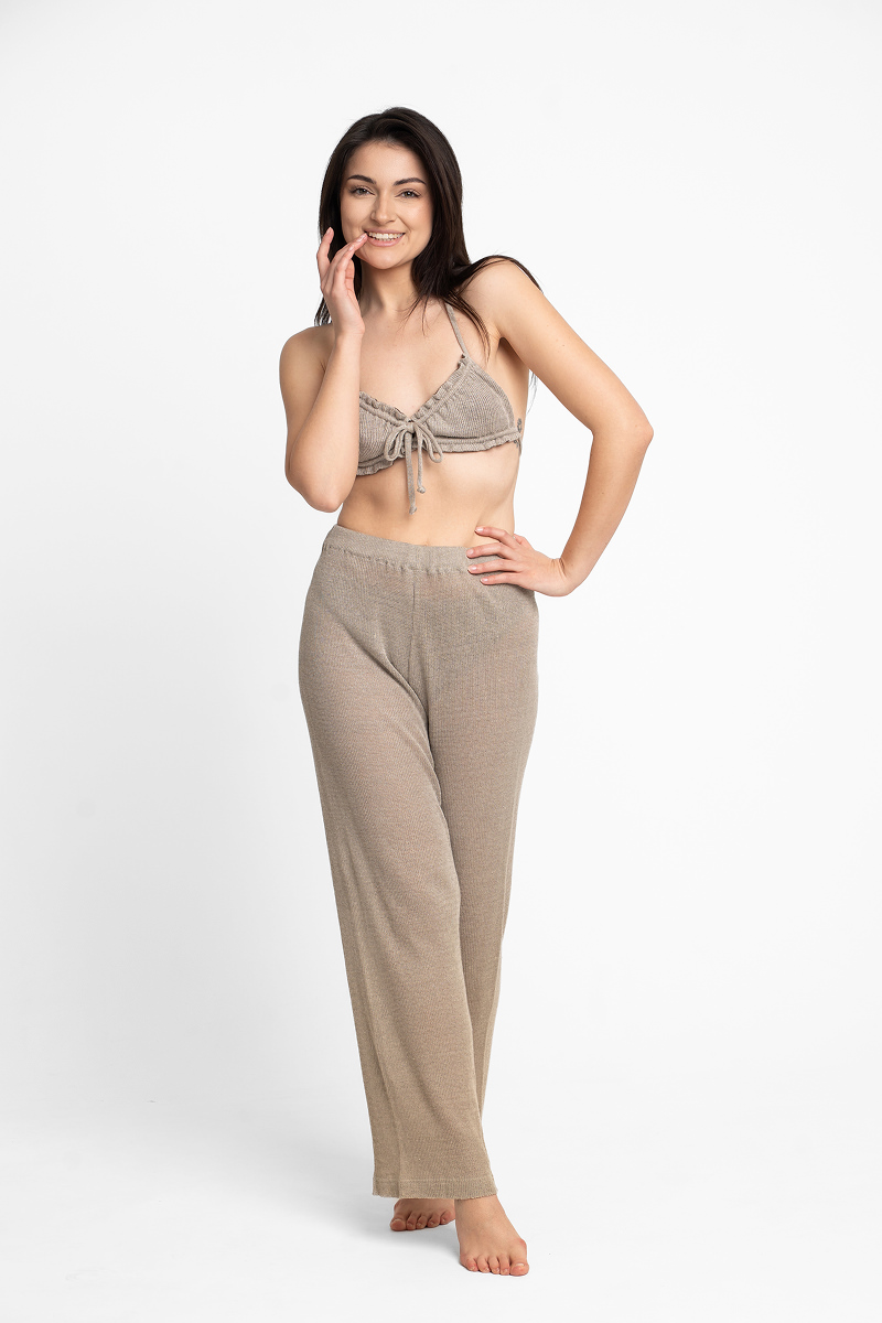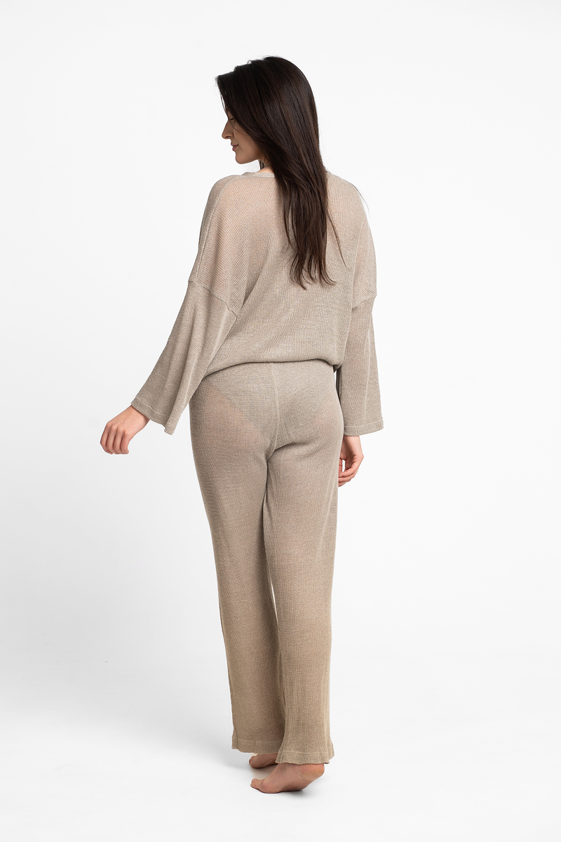 Poczuj luksus naturalnych materiałów na własnej skórze. Spodnie Simple to połączenie komfortu z wyrafinowanym stylem wakacyjnego kurortu. Szerokie nogawki i elastyczna struktura dzianiny lnianej sprawiają, że każdy ruch staje się lekki i swobodny.